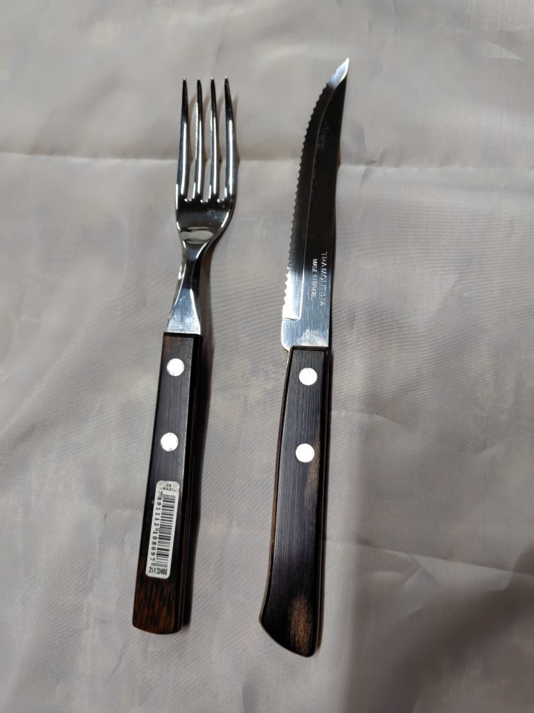 特殊なポリエステル溶液を浸した木板を何枚も重ねてパッカーウッド仕様。 食器洗浄機対応。 耐火性、衝撃にも強いハンドルです。これ以外にも多数のカトラリーサンプルを用意しております。