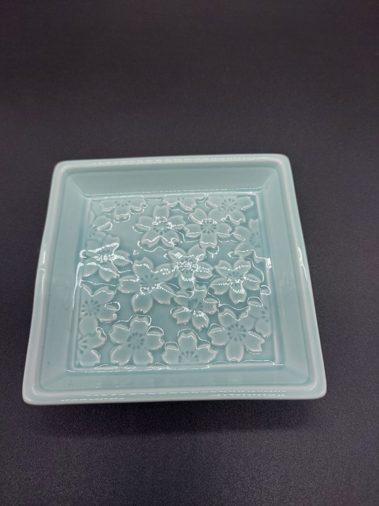 ヒスイ桜彫 銘々皿 (11.7×11.7×2.3㎝)・・・¥350.- 別途、消費税かかります。